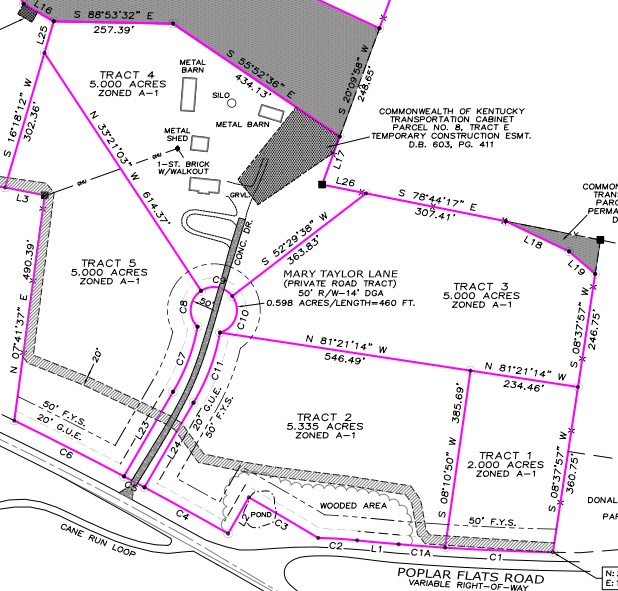 Tract 2- 5.335 acres zoned A-1 located on Poplar Flats Road and Mary Taylor Lane. There is a 20-foot waterline easement owned by the City of Bardstown.